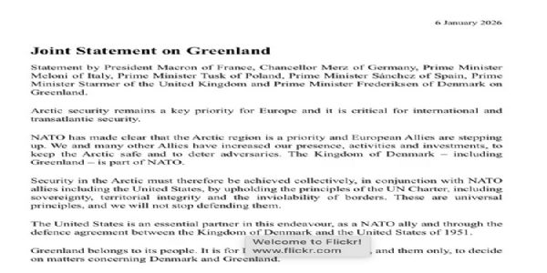 کوپن ہیگن/ برسلز، 6 جنوری (ہ س) امریکی صدر ڈونالڈ ٹرمپ کے گرین لینڈ کے بارے میں حالیہ تبصروں نے یورپ میں سفارتی تناؤ کو جنم دیا ہے۔ فرانس، برطانیہ، جرمنی، اٹلی، پولینڈ، اسپین اور ڈنمارک کے رہنماؤں نے ایک مشترکہ بیان جاری کیا جس میں واضح کیا گیا کہ